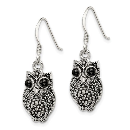 Sterling Silver Antiqued Marcasite/Blk Agate Owl Shepherd Hook Earrings
