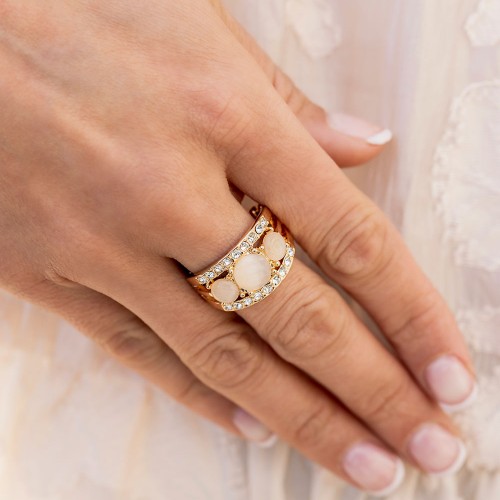 Encased in sleek gold fittings, a bubbly collection of champagne cat’s eye stones and glassy white rhinestones coalesce into mismatched frames that delicately connect around the wrist for an effervescent elegance. Features an adjustable clasp closure.