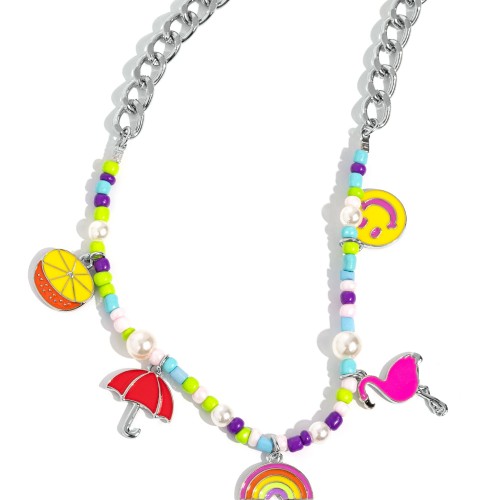 A thick, flat silver curb chain leads down the neckline to a section of purple, baby pink, light blue, and Kohlrabi seed beads and various-sized white pearls. A collection of seasonal charms gather along the colorful display, including a pink flamingo, a High Visibility and Rose Violet smiley face, a Pantone-colored rainbow, a red umbrella, and a burnt orange and yellow-colored orange slice. Features an adjustable clasp closure.