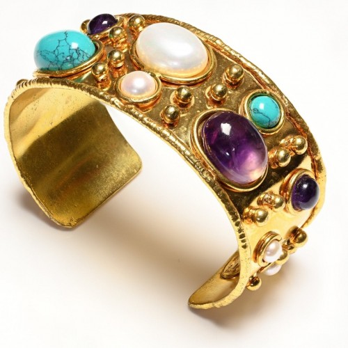 Sylvia Toledano Paris Gold Plated Byzantine Pearl Turquoise Amethyst Cuff Bracelet
