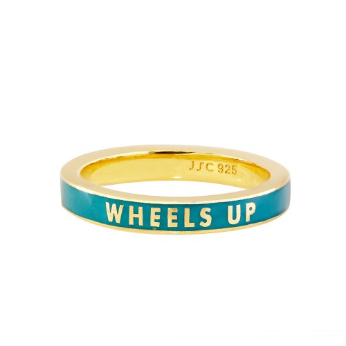 This green enameled travel-inspired ring in 18k gold vermeil features the words “Take Me Away,” or “Wheels Up” when rotated. It’s a fun and colorful way to show your love of travel and looks great either stacked with additional rings or worn alone.