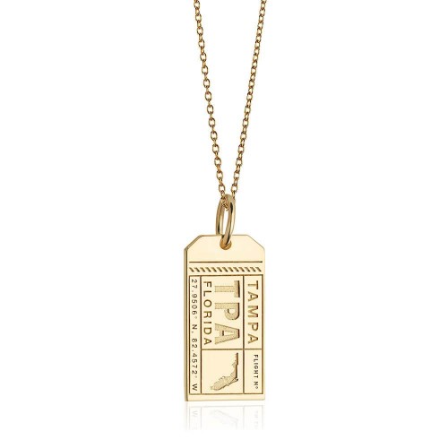 This 14k gold vermeil luggage tag charm features the Tampa International Airport IATA code, TPA. Adjacent to miles of sunny Gulf Coast beaches, the birthplace of the Cuban sandwich (who knew?) and home to the mighty MacDill Air Force Base, this Florida hub welcomes all comers. Report for duty here, and expect good things.