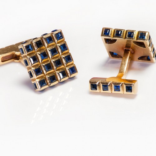Vintage circa 1950’s Tiffany & Co. 18K gold sapphire cufflinks. Step back into the elegance with these Tiffany & Co. Yellow Gold Sapphire Cufflinks. Crafted in radiant 18K yellow gold, these exquisite cufflinks feature rich blue sapphires that add a touch of timeless luxury.