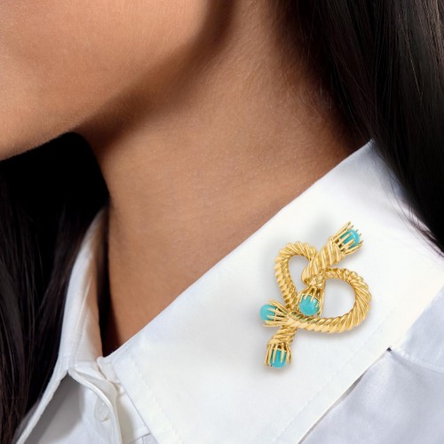 Tiffany & Co. Schlumberger 1960’s Turquoise 18 Karat Yellow Gold Vintage Rope Heart Brooch