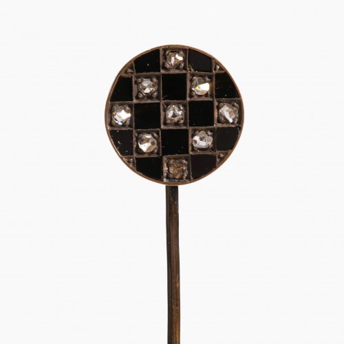 This transitional stick pin features a rich garnet set in a refined gold design.