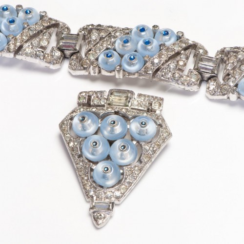 Trifari 1940’s Alfred Philippe Moonstone Glass Beads Crystal Bracelet Clip Set