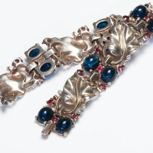 Trifari 1945 Alfred Philippe Sterling Blue Cabochon Red Crystal Leaf Bracelet