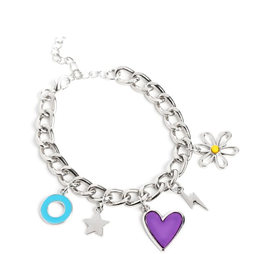 A strand of thick silver curb chain is decorated in playful charms, including a purple heart, a silver lightning bolt and star, a blue ring, and a flower silhouette topped with a yellow bead at its center. Features an adjustable clasp closure.
