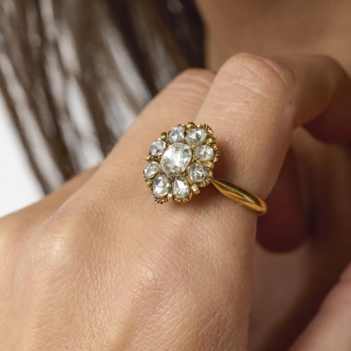 Delicately radiant and rich in history, this Victorian cluster ring showcases nine luminous rose cut diamonds arranged in a timeless floral motif. The softly domed facets of each diamond catch the light with a romantic glow, reflecting the candlelit elegance of the 19th century. Crafted in warm 18k yellow gold, the ring combines an original Victorian top with a later vintage shank, preserving its antique beauty while ensuring lasting strength and wearability. Elegant and sentimental, this piece captures the essence of the Victorian era—romantic, refined, and forever captivating.