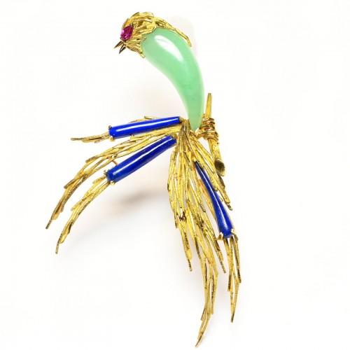 Bird of Paradise Brooch Chrysoprase Lapis & Diamond