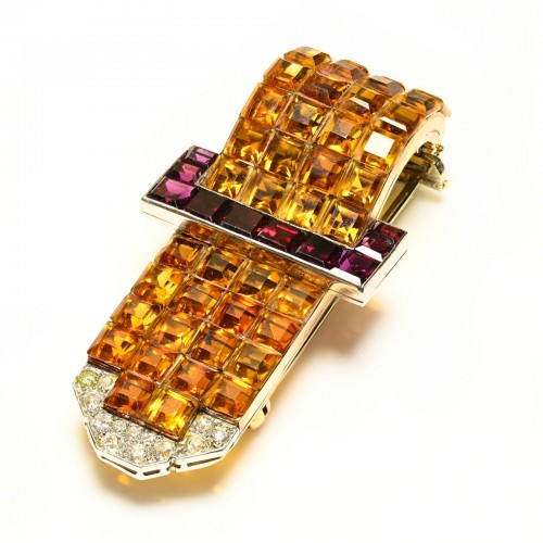 Perfect for collectors and lovers of fine jewelry, this brooch is a true testament to artistry, featuring intricate detailing and the harmonious blend of vibrant colors and precious stones.