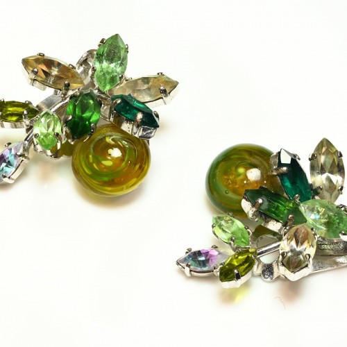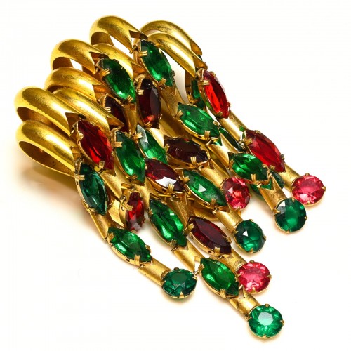 A striking jewel from the glamorous 1940s, this brooch embodies movement, color, and refined artistry. Tassels adorned with brilliant red and green crystals, shimmer with timeless allure. From the lower element, a cascade of fine tassels flows gracefully, creating a sense of rhythm and lightness with every motion.