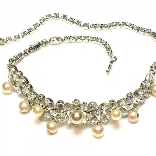 A radiant creation from the celebrated American jeweler Kramer of New York, this 1950’s choker necklace embodies the glamour and refinement of mid-century costume jewelry. Designed as a close-fitting collar, it shimmers with rows of luminous faux pearls, interspersed with brilliant crystal accents that catch the light with every movement. The harmonious blend of soft luster and sparkling brilliance reflects Kramer’s reputation for creating jewelry that rivaled the look of fine gems.