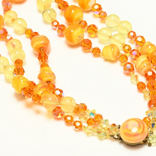 A luminous creation from the atelier of Louis Rousselet, one of Paris’s most celebrated makers of glass jewelry, this 1950’s necklace radiates warmth and sophistication. Handcrafted orange and yellow glass beads, each individually fashioned with Rousselet’s signature artistry, evoke the brilliance of natural gemstones while capturing the light with extraordinary depth and vibrancy.