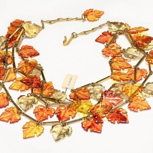 Vintage 1960’s Brown Yellow Lucite Leaf Charm Chain Necklace