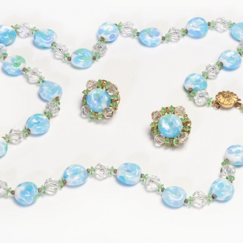 Vintage 1960’s Hobe Blue Green Glass Beads Crystal Earrings Necklace Set