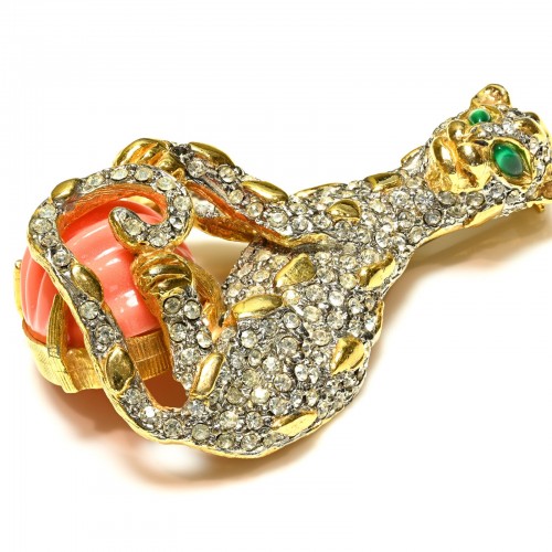 An emblem of 1960s fantasy couture by Kenneth Jay Lane, this striking brooch features a regal panther silhouette adorned with sparkling pavé crystals across its body. The feline’s eyes are set with vivid emerald-green glass stones, lending unmatched intensity and dramatic flair—hallmarks of KJL’s theatrical design language. Length 2.3 inches.