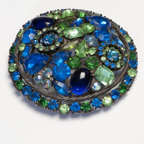 Vintage 1960’s Large Green Blue Cabochon Glass Crystal Round Brooch
