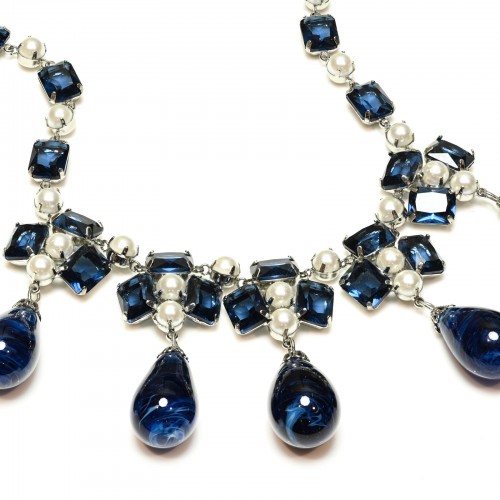 This exceptional vintage 1963 Henkel & Grosse necklace is a brilliant example of the German maison’s prestigious craftsmanship and mid-century elegance. Designed with radiant blue glass crystals, luminous faux pearls, and sculpted silver-tone metal, the necklace reflects the refined artistry and impeccable construction that made Henkel & Grosse a long-time jewelry partner of Dior and a leader in European couture accessories.