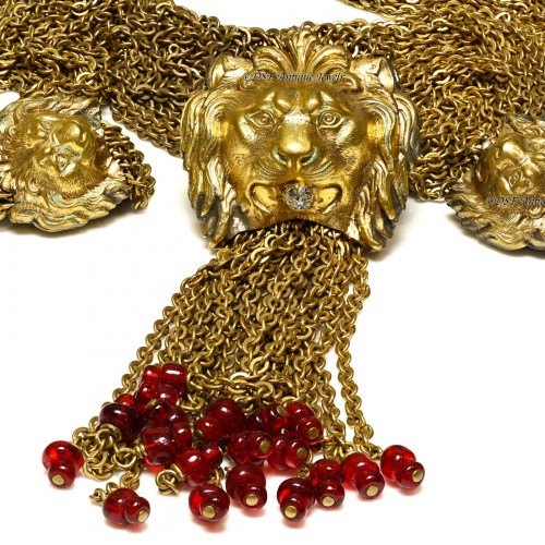 The necklace features a dramatic lion, suspended from bold chains, set with richly glowing red Gripoix poured glass. The deep crimson glass radiates warmth and intensity, evoking the look of precious rubies while retaining the distinctive organic depth that only true Gripoix can achieve. Length 34 inches.