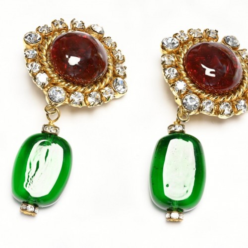 Vintage 1980’s Chanel Paris Maison Gripoix Red Green Glass Crystal Drop Earrings
