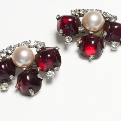Vintage 1980’s French Red Cabochon Glass Pearl Crystal Earrings