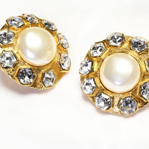 Be the first to review “Vintage 1990’s Chanel Paris Gold Plated Diamanté Crystal Pearl Flower Earrings” Cancel reply