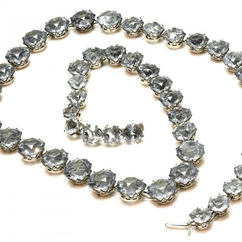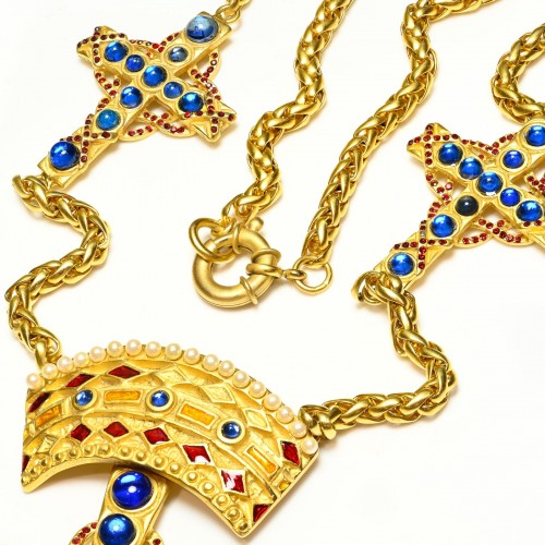 Crafted in Italy during the late‑1990s, this striking pendant necklace represents a glamorous collaboration between Ugo Correani—Versace’s visionary accessory designer—and the Italian couture house of Gianni Versace. A central cross motif, richly embellished with vivid blue and red glass cabochons, suspends from a sculpted gilt‑metal chain, each link echoing architectural and Etruscan-inspired detailing.