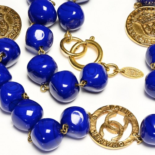 Vintage 1991 Chanel Maison Gripoix Blue Glass Beads CC Coin Medallion Sautoir Necklace