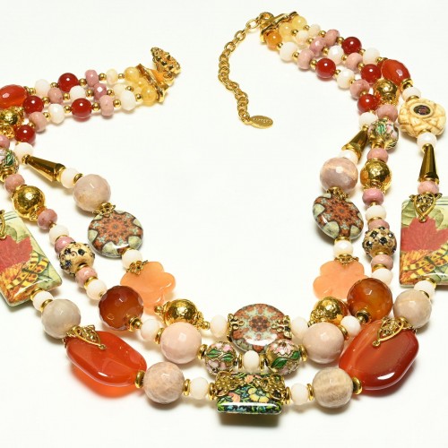 Elevate your collection with this exquisite vintage collar necklace by renowned designers Jose & Maria Barrera. A captivating fusion of artistry and opulence, this statement piece features vibrant orange and green millefiori glass beads, each one a miniature mosaic of intricate floral patterns. The handcrafted beads are gracefully strung along a gold-tone framework, creating a rich tapestry of color and texture that drapes beautifully at the neckline.