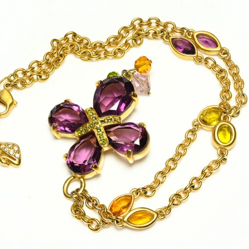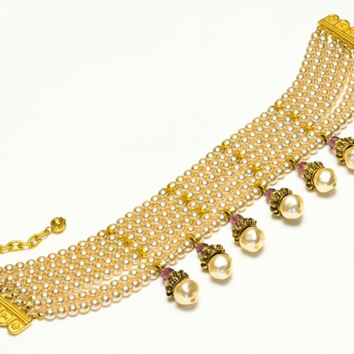 Catherine Prevost is celebrated for her unique approach to jewelry, blending classical elements with contemporary flair. This choker exemplifies her signature aesthetic, combining luxurious textures with a regal color palette. The interplay of creamy pearls and rich purple tones exudes an air of vintage glamour, perfect for adding a touch of opulence to any ensemble.