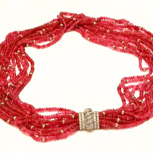 A magnificent example of Chanel’s haute couture jewelry, this vintage necklace highlights the legendary collaboration between the house of Chanel and the famed glassmakers of Maison Gripoix. The centerpiece is a bold Byzantine-inspired cross, set with radiant hand-poured Gripoix glass cabochons in vivid ruby red and emerald green. Each jewel glows with rich translucence, framed in a finely gilt setting that enhances the depth and vibrancy of the colors.