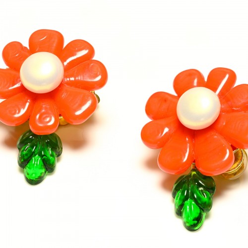Vintage Chanel jewelry from the 1998 Cruise collection, particularly pieces featuring Gripoix glass in orange and green hues with camellia motifs, are highly sought after by collectors due to their rarity and distinctive design. Gripoix glass, known for its rich colors and handcrafted quality, has been a hallmark of Chanel’s costume jewelry, adding to the allure of these vintage items. Approximate Measurements: Length 1.35″.