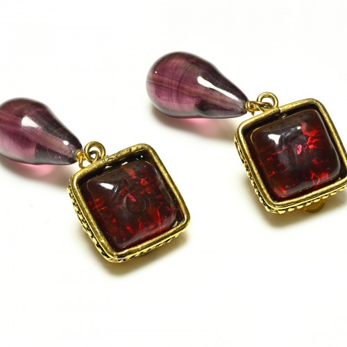 A radiant example of timeless French craftsmanship, these vintage Chanel drop earrings are a stunning creation from the legendary collaboration between Chanel and the esteemed Maison Gripoix. Handcrafted in Paris, each earring features luminous red and purple poured glass cabochons—an iconic Gripoix hallmark—set in richly gilded metal.