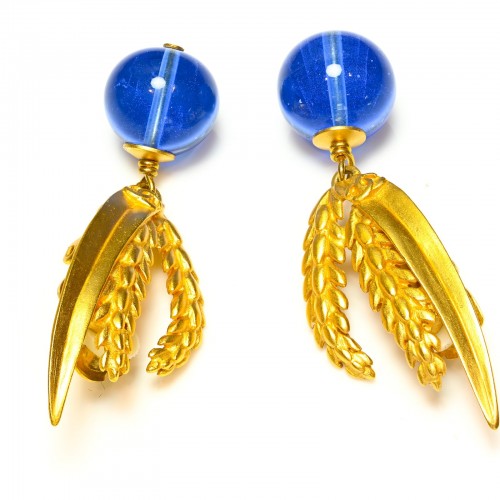 From Chanel’s Spring 1999 collection, these exquisite earrings embody the maison’s artistry in both design and material. Handcrafted with signature Gripoix poured glass, the deep blue cabochons are framed in a stylized wheat motif, symbolizing prosperity and abundance—an emblem often revisited in Chanel’s heritage collections.