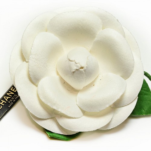 Vintage Chanel Paris White Green Silk Large Camellia Brooch