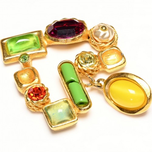 Indulge in the luxurious beauty of this Vintage Christian Lacroix Paris pendant. Featuring a stunning heart-shaped design adorned with vibrant purple, yellow, and green crystals, it is the perfect statement piece for any outfit. Elevate your style with this exclusive and sophisticated accessory. Approximate Measurements: Length 2.5″, Width 2″. Made in France.