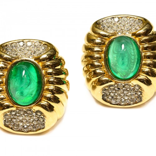 Materials: Gold-plated metal, green glass cabochons, clear crystals