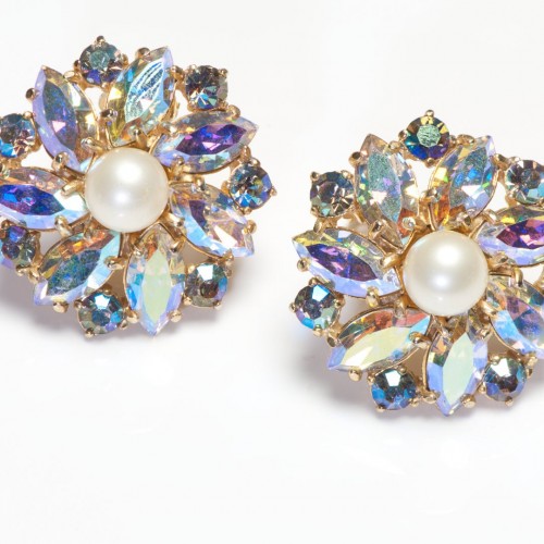 Vintage Elsa Schiaparelli Aurora Borealis Crystal Pearl Flower Earrings.