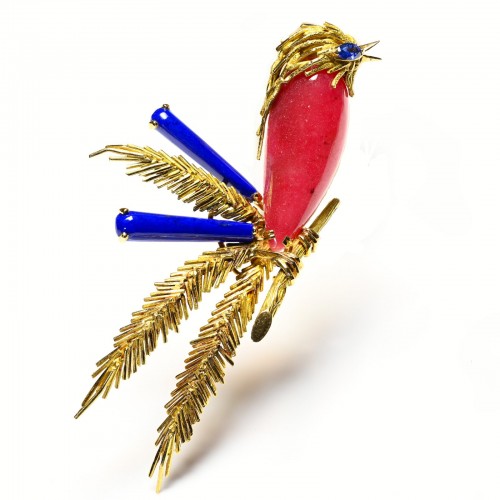 This extraordinary vintage French brooch is a true marvel of craftsmanship and ingenuity. Crafted from luxurious 18K gold, it features an exquisite mechanical design that reveals a beautifully detailed bird, adorned with vibrant blue agate, dazzling diamonds, rich sapphires, and a single radiant ruby.
