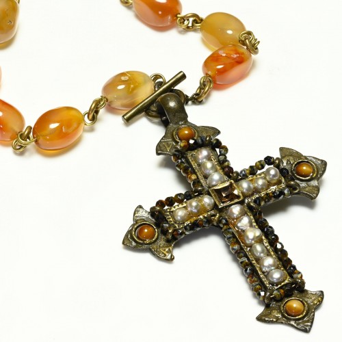 The “Vintage Gerard Yosca Brown Agate Pearl Cross Pendant Necklace” exemplifies his signature style, featuring a harmonious blend of earthy brown agate stones and lustrous pearls, centered around a cross pendant. This design reflects Yosca’s ability to merge classic elements with contemporary aesthetics.