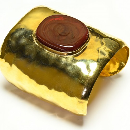 Gerard Yosca is a renowned jewelry designer celebrated for his distinctive and bold creations, often incorporating materials like agate, pearls, and intricate cross motifs. His vintage pieces are highly sought after by collectors and fashion enthusiasts alike.
