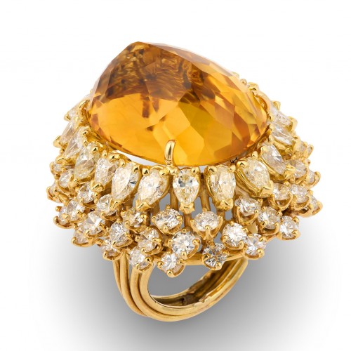This striking vintage ring centers a luminous Kenyan ruby, its smooth cabochon surface glowing with rich natural depth. The ruby’s untreated purity adds rarity and allure, while two bright VS-quality diamonds set in refined bezels provide crisp contrast and elegant brilliance. Crafted in bold, high-polished 18k yellow gold, the ring has a luxurious presence and a sculptural silhouette that embodies the sophisticated style of the 1980s. A distinctive and timeless statement piece.