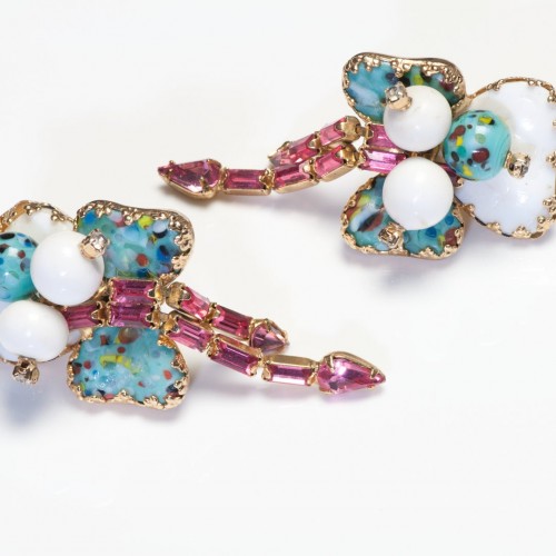 Vintage Hobe Turquoise Blue White Glass Pink Crystal Tassel Clover Earrings