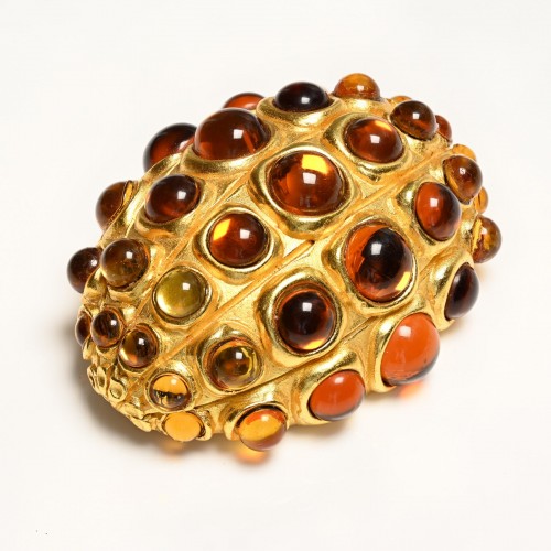 Elevate your style with this luxurious Vintage Jeanne Lanvin Paris Brooch. Crafted with gold plating and a stunning brown cabochon glass, this elegant piece evokes a sense of vintage glamour. Complement any outfit with this timeless and exclusive accessory. Length 1.8″.