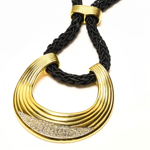 A striking vintage Lanvin Paris necklace, featuring an elegant gold-plated rope chain with a statement crystal-embellished pendant. A true collector’s piece that embodies the timeless sophistication of the renowned French fashion house.
