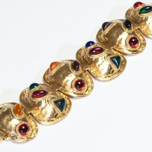 Vintage Les Bernard Wide Gold Plated Red Green Blue Cabochon Chain Bracelet