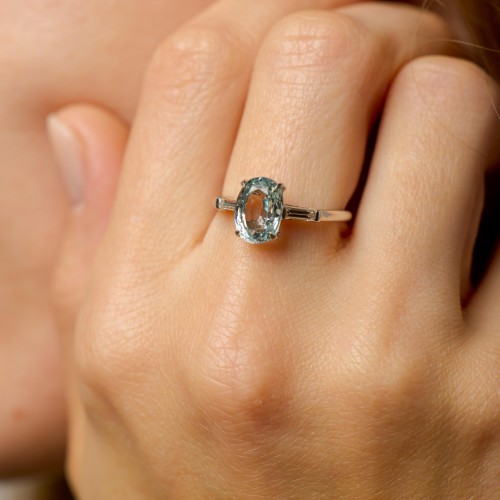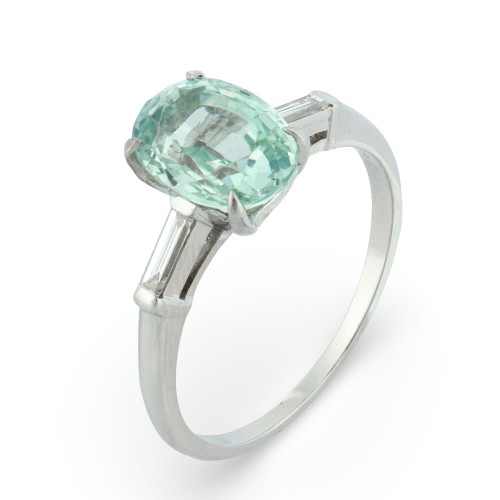 Vintage GIA 3.44 oval cut teal sapphire diamond platinum ring