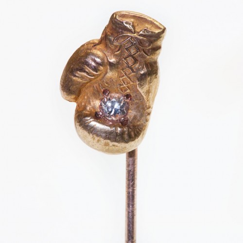 This vintage stick pin features exquisite plique-à-jour enamel work, set in gold and accented with a lustrous pearl and sparkling diamonds.
