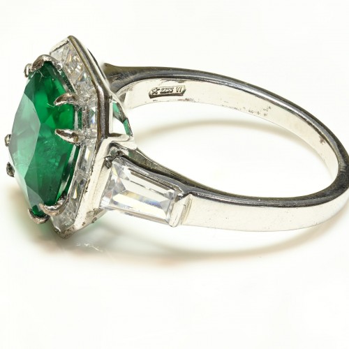 A striking statement piece, this vintage cocktail ring showcases a bold emerald-green glass paste gem—often emerald-cut or cabochon—set within a finely crafted sterling silver setting. Designed to capture attention, it reflects the glamour and boldness of mid-century and earlier dress jewelry. Size 8.